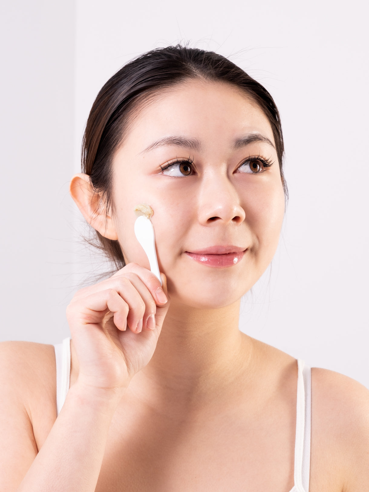 - Gently massage onto your face in circular motions, focusing on oily or congested areas